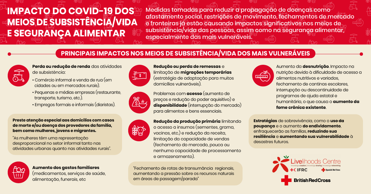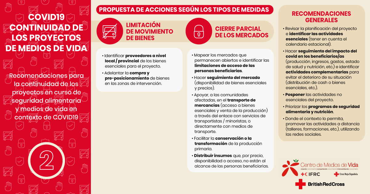 - En todos los países, aunque en diferente grado dependiendo de las infraestructuras de salud pública y redes de protección social y económica, esta crisis está afectando a todos los sectores y colectivos de la población. El cierre de comercios, la disrupción de los mercados y cadenas de producción, la limitación del transporte de mercancías y la movilidad de personas, etc., están teniendo un efecto directo en los Medios de Vida de las personas y en la Seguridad Alimentaria de las poblaciones, sobre todo de aquellas que ya estaban en una situación de vulnerabilidad.